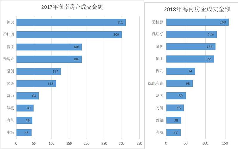 2017年海南TOP10房地产商成交金额1426亿元人民币,2018年成交金额849亿元人民币,成交金额同比下降40.46%,各大房企布局在全岛的旅居项目业绩在422全域限购后戛然而止。