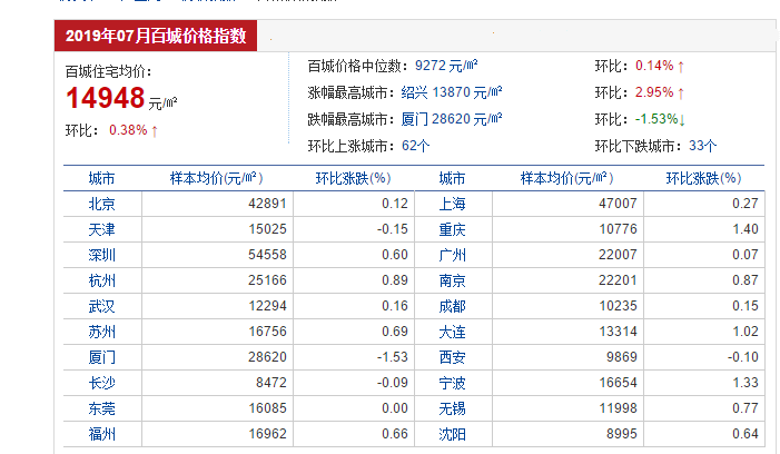 2019年8月2日,在中指院发布的7月百城住宅价格指数中,可以看到,7月份全国100个城市(新建)住宅平均价格为14948元/㎡,环比上涨0.38%,涨幅较上月扩大0.01个百分点。