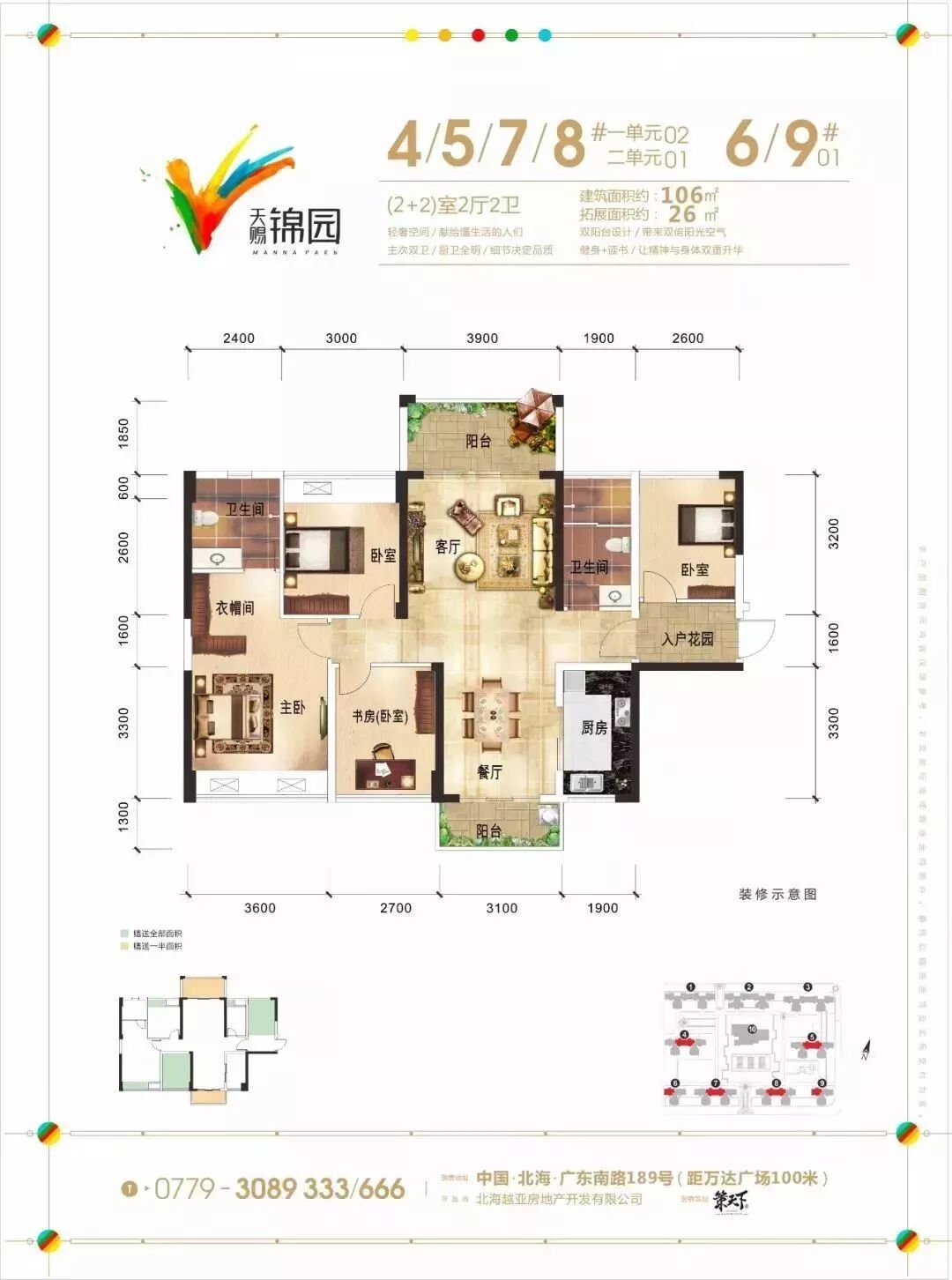 2+2室2厅2卫建筑面积106㎡,拓展面积26㎡双阳台设计,主次双卫、厨卫全明健身+读书,精神与身体双重升华。