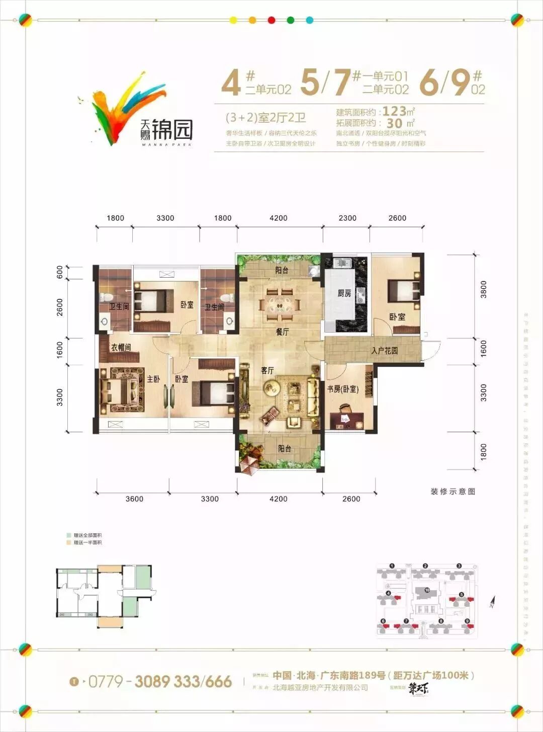 3+2室2厅2卫建筑面积123㎡,拓展面积30㎡南北通透,双阳台尽享阳光空气独立书房、个性健身房,时刻精彩。