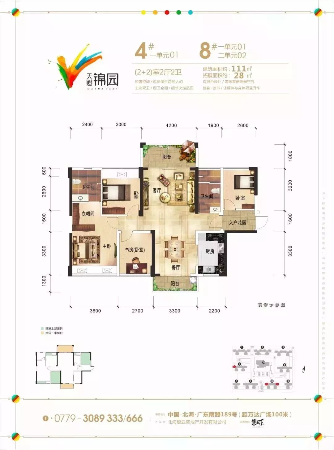 2+2室2厅2卫建筑面积111㎡,拓展面积28㎡双阳台设计,带来双倍阳光空气主次双卫、厨卫全明。