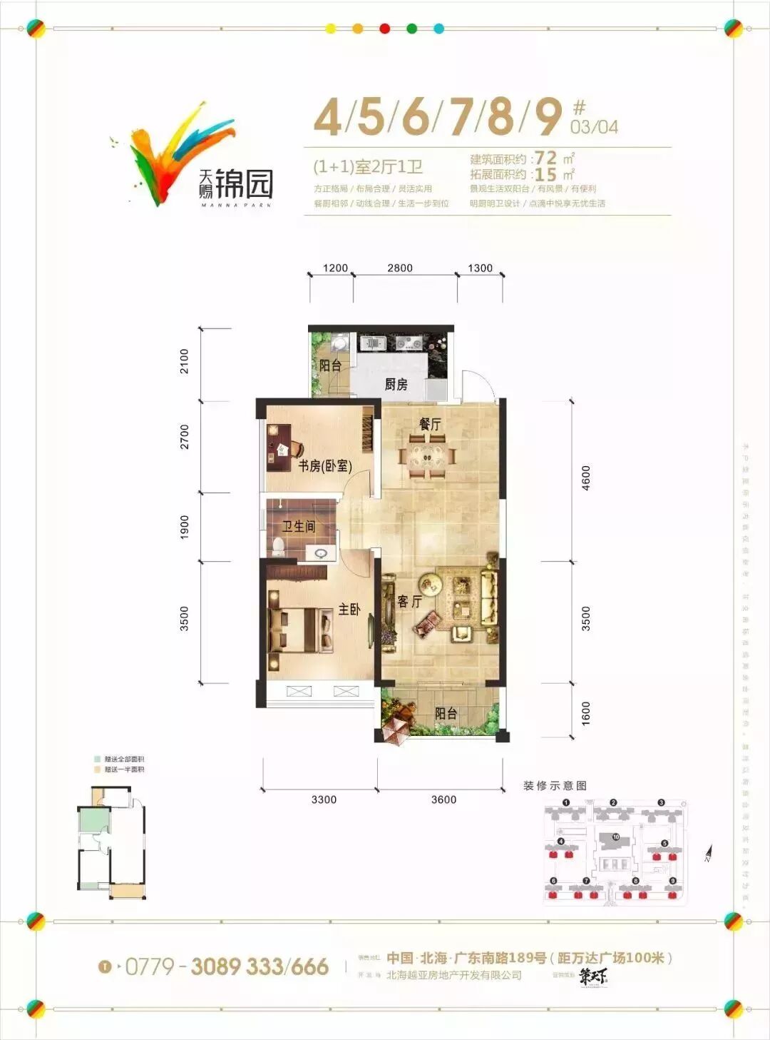 北海新商业CBD核心区域;万达广场正对面;周边配套成熟完善;大型高端城市级商业综合体;完全人车分流设计;小区配套:休闲步道,水景喷泉,花池,篮球场,羽毛球场,儿童乐园,恒温泳池,水系,健身中心,台球室,餐饮茶棋等;户户南北朝向,全明设计,户户观景;超大赠送面积。